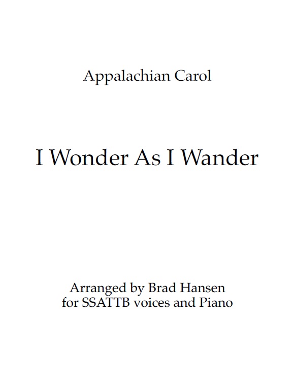 I Wonder as I Wander Appalachian Carol. Arranged by Brad Hansen. This treatment is dark and moody, with some dissonant harmonies.Start the audio first, then immediately open the score. https://hansenmedia.net/wp-content/uploads/04-I-Wonder-as-I-Wander.mp3 Genre: Choral, AccompaniedParts: Piano, SSATTB Difficulty: Late IntermediateBy downloading this music, you agree to the Music Permissions restrictions. Open Score